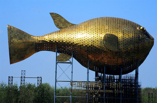 近日,江蘇揚(yáng)中一座"河豚"巨型雕塑成為網(wǎng)絡(luò)熱議話題。這條金光燦燦,搖頭擺尾的"河豚",黃銅披身,是揚(yáng)中市的新地標(biāo),也是9 月27日開幕的第八屆江蘇省園博會(huì)的重要標(biāo)志。僅就其本身的設(shè)計(jì)而言,足以引人注目乃至贊嘆。然而,不同的聲音在于,傾注7000萬 元巨資興建這樣一個(gè)地標(biāo),真的值嗎?有網(wǎng)友直言,在中央八項(xiàng)規(guī)定、厲行節(jié)約等要求和精神下,與"面子工程"相比,民生實(shí)事才更加 緊迫。